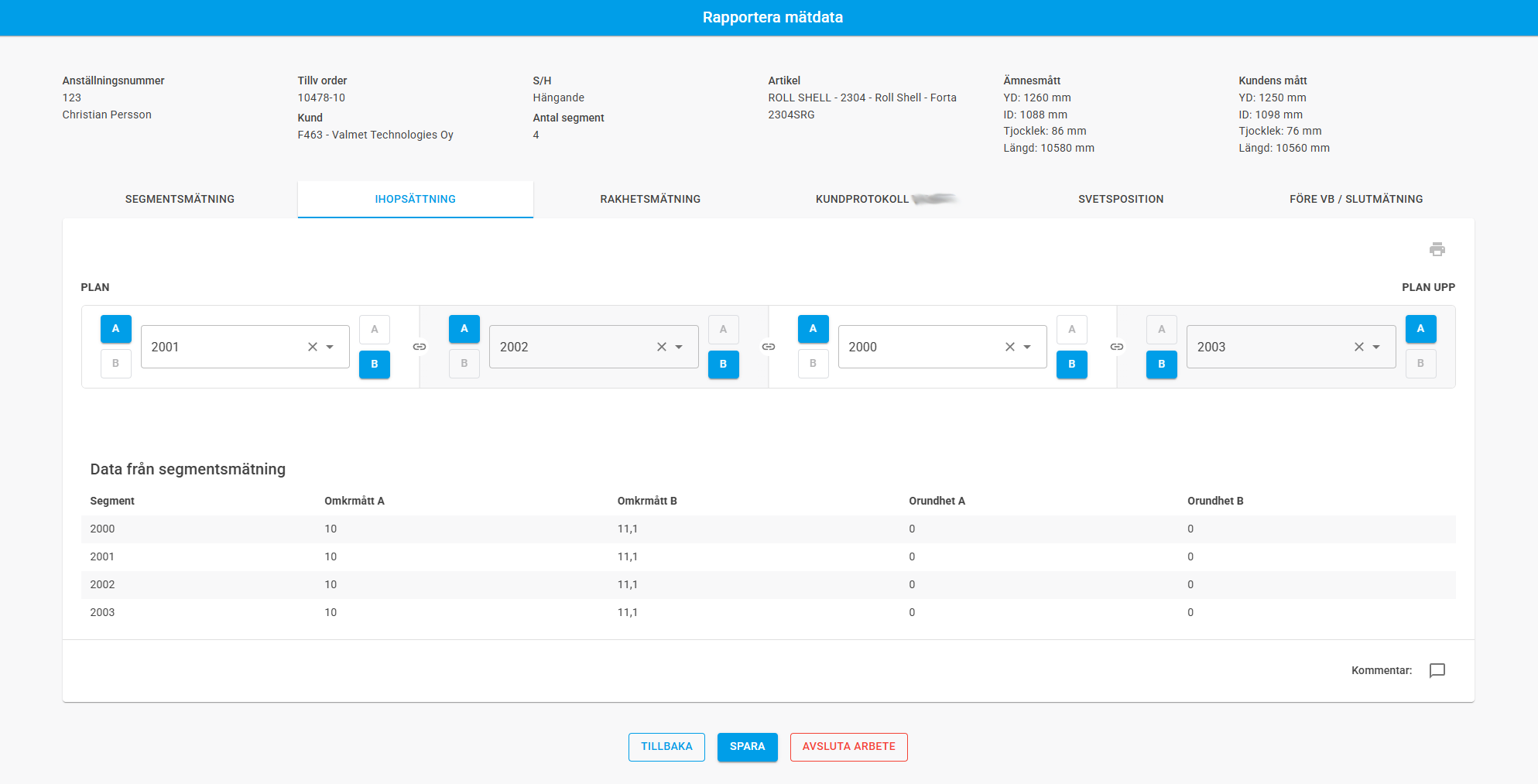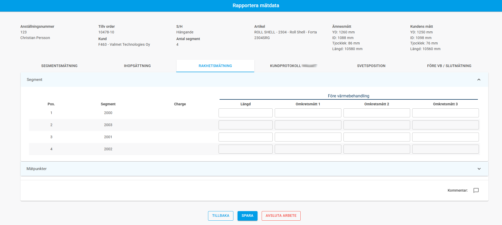 Program för att administrera och rapportera mätprotokoll av olika typer kopplade till Operationer på tillverkningsordrar i Monitor. Användaren anger sitt anställningsnummer och kan sedan stämpla in på olika mätoperationer. Varje flik representerar ett specifikt moment.